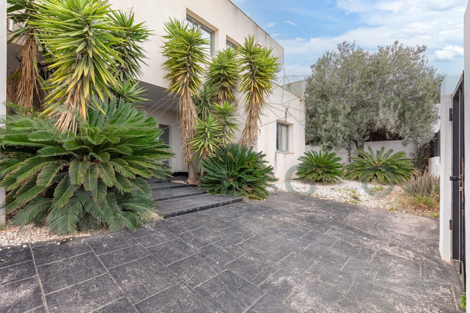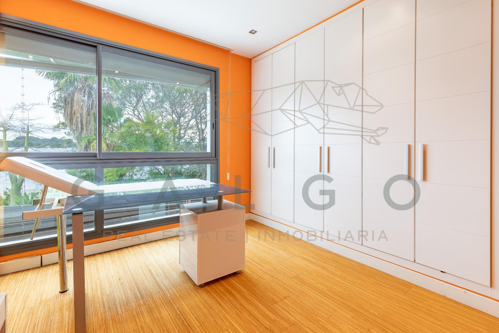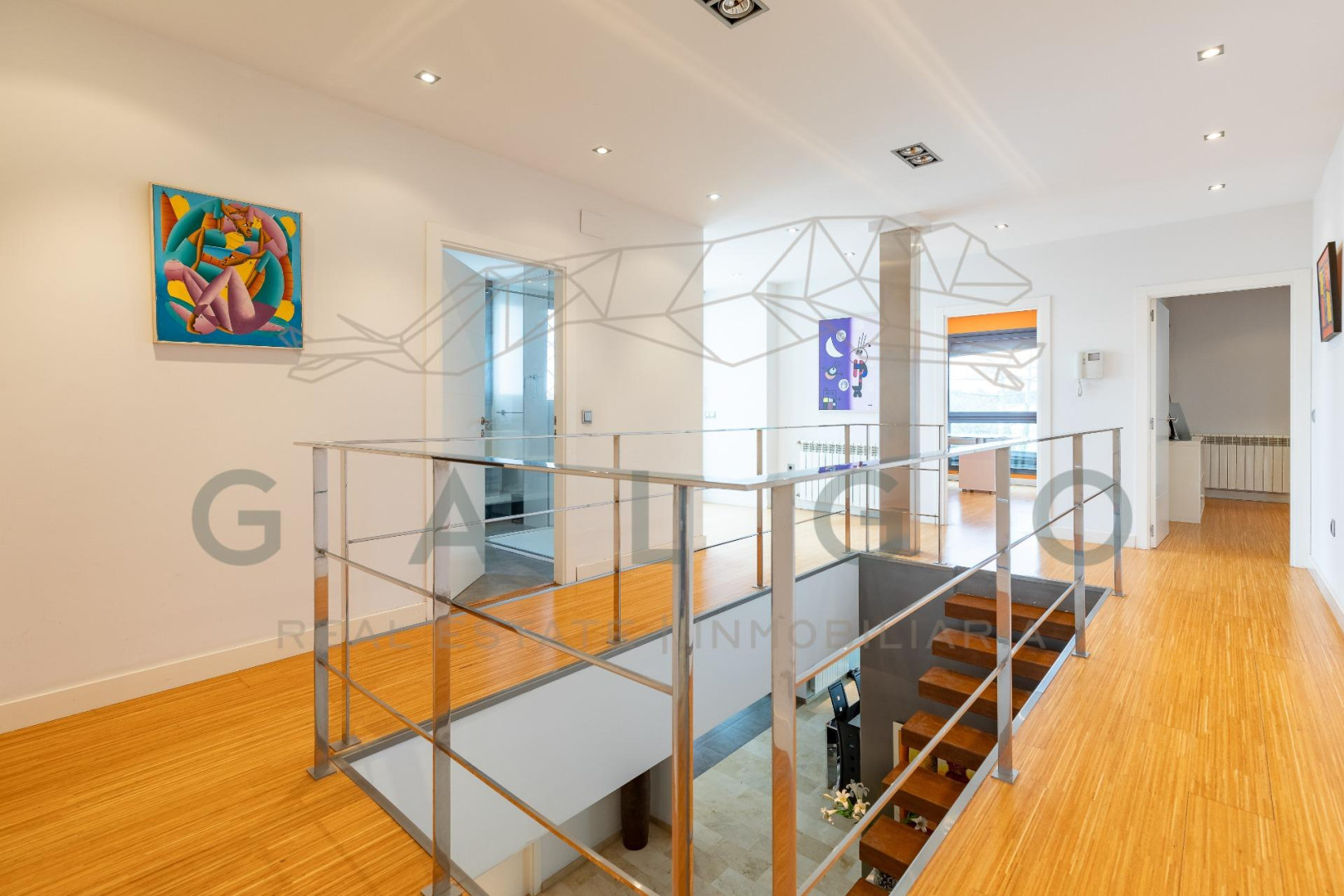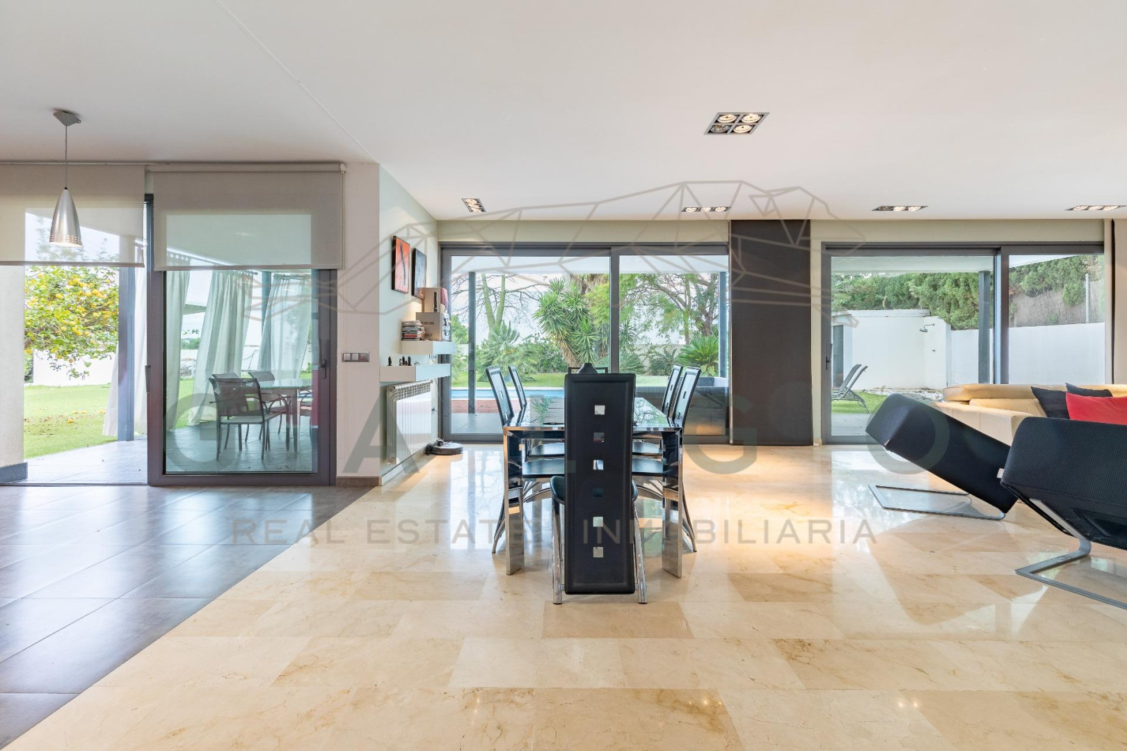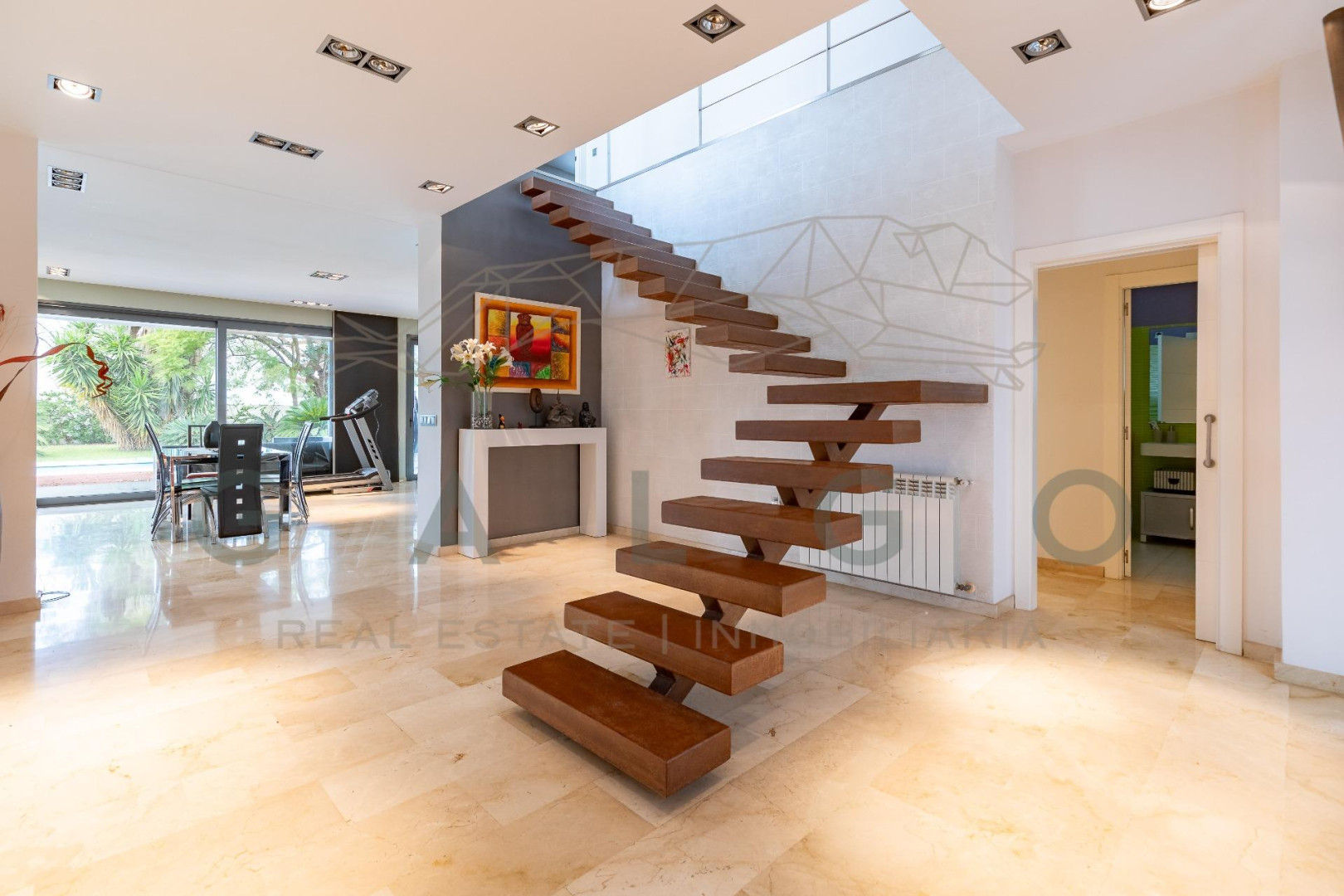 Desde el primer momento, la villa impresiona por sus espacios abiertos y su diseño contemporáneo. En la entrada, encontramos un maravilloso hall con una escalera de hierro suspendida que da acceso a la planta superior.