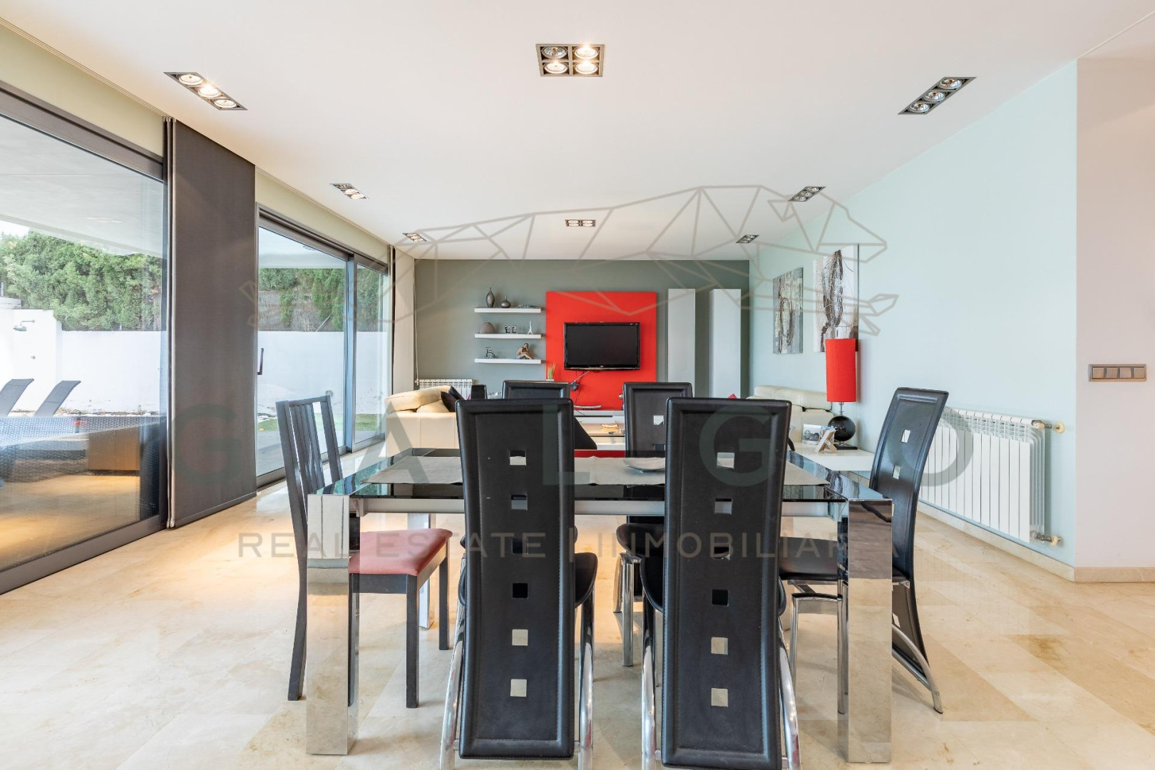 En la planta baja se sitúa un espacioso salón-comedor bañado en luz natural gracias a sus grandes ventanales de suelo a techo, que no solo proporcionan vistas espectaculares al jardín, sino que también permiten una conexión fluida con el exterior. La cocina de concepto abierto, moderna y elegante, se integra perfectamente en el espacio y ofrece acceso directo a la zona de lavandería. Junto a la cocina, el garaje sin terminar brinda la posibilidad de adaptarse a las necesidades del futuro propietario, ya sea como gimnasio, sala de juegos o cualquier otro espacio personalizado.