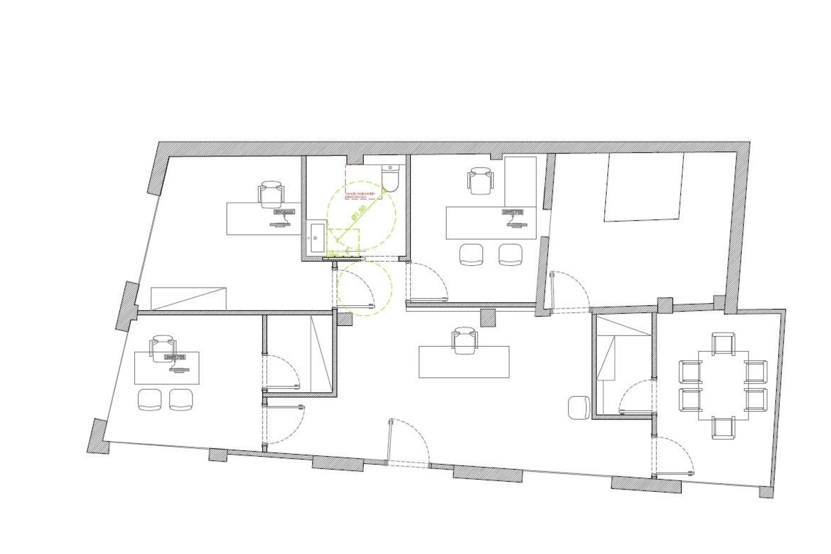 Se trata de un bajo esquinero con 4 ventanales a fachada y un patio de luces interior. Está planteado para distribuirlo en 4 oficinas independientes, una zona común en la entrada a la propiedad, dos baños y con posibilidad de ubicar una cocina junto al patio de luces.